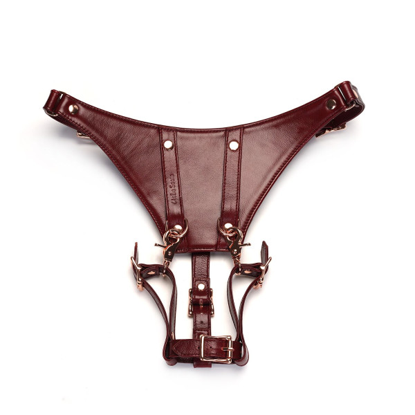 Шкіряні трусики Liebe Seele Wine Red Forced Orgasm Strop виконані в елегантному винному відтінку, який прекрасно доповнює фурнітура кольору рожевого золота. Це не тільки зручний та функціональний, але й розкішний аксесуар для ваших найкращих БДСМ-сесій! Не забудьте доповнити його відповідним нашийником, наручниками та іншими деталями.